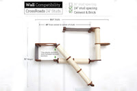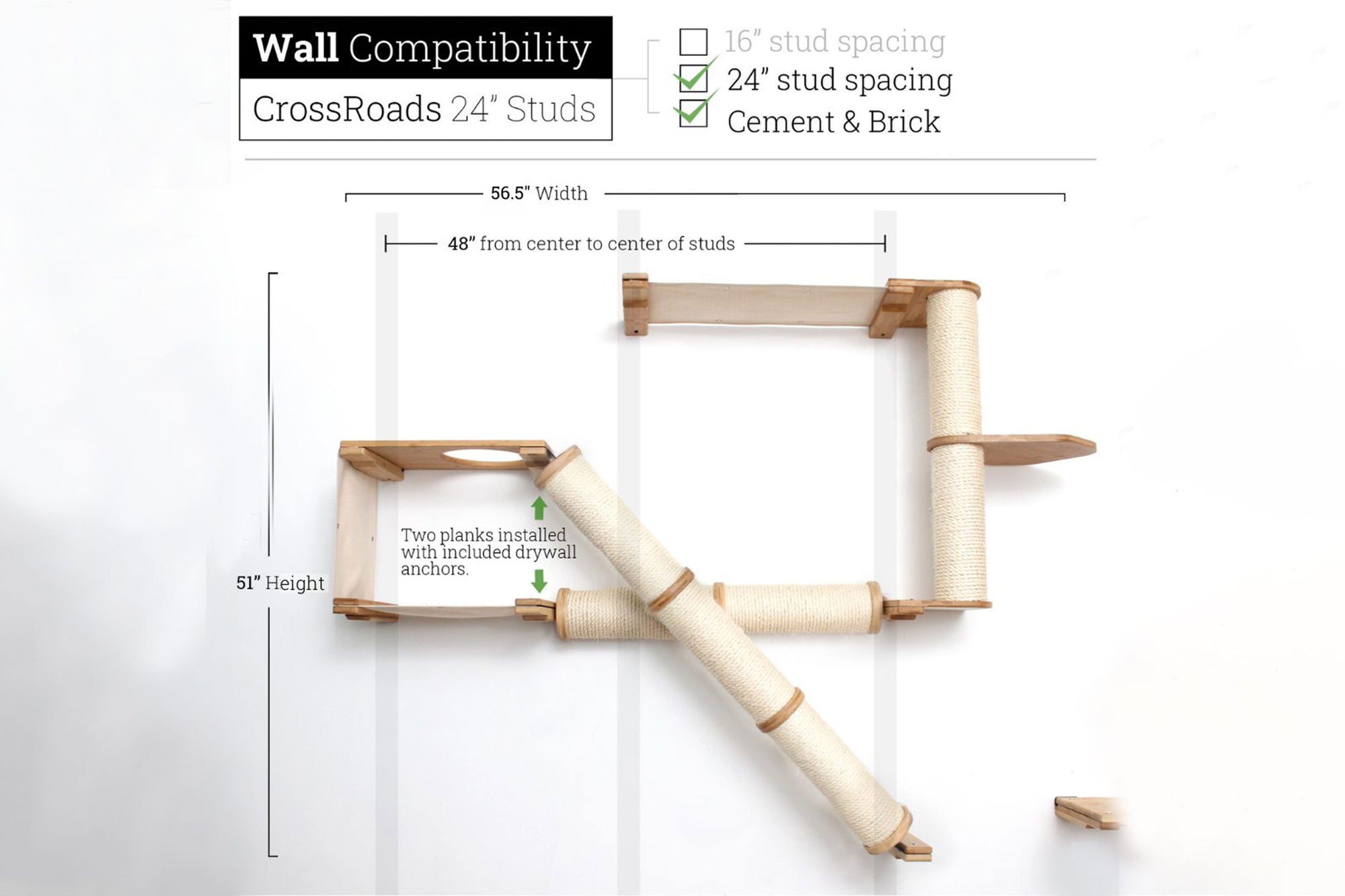 Whether you have an energetic feline companion or one who prefers naps and could use some additional exercise, The Crossroads has it all. It’s a cat tree for large cats that also work really well with kittens. Our innovative scratching pole design allows you to attach poles to the mounting planks at multiple positions from the wall, which creates fun routes around the scratching wall.