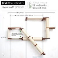 Whether you have an energetic feline companion or one who prefers naps and could use some additional exercise, The Crossroads has it all. It’s a cat tree for large cats that also work really well with kittens. Our innovative scratching pole design allows you to attach poles to the mounting planks at multiple positions from the wall, which creates fun routes around the scratching wall.