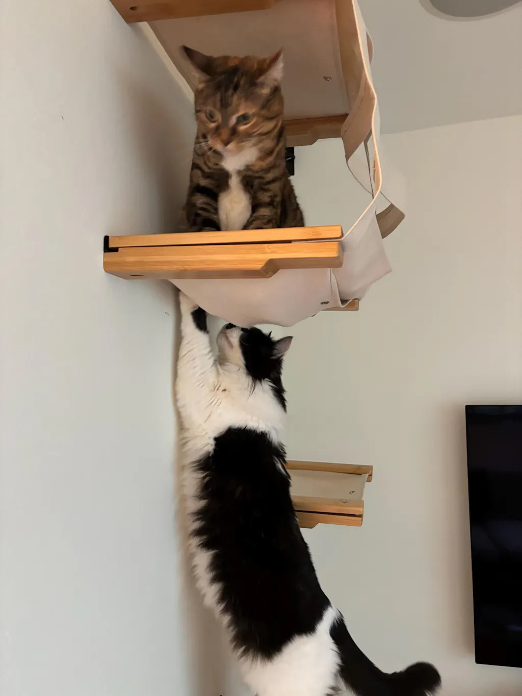 These are our least favorite purchase from Catastrophic Creations. They do not hold up to the cats’ weight and as time goes on they sag on the unsupported side. We have plaster walls which may be our problem. We are considering replacing these or shoring them up.
