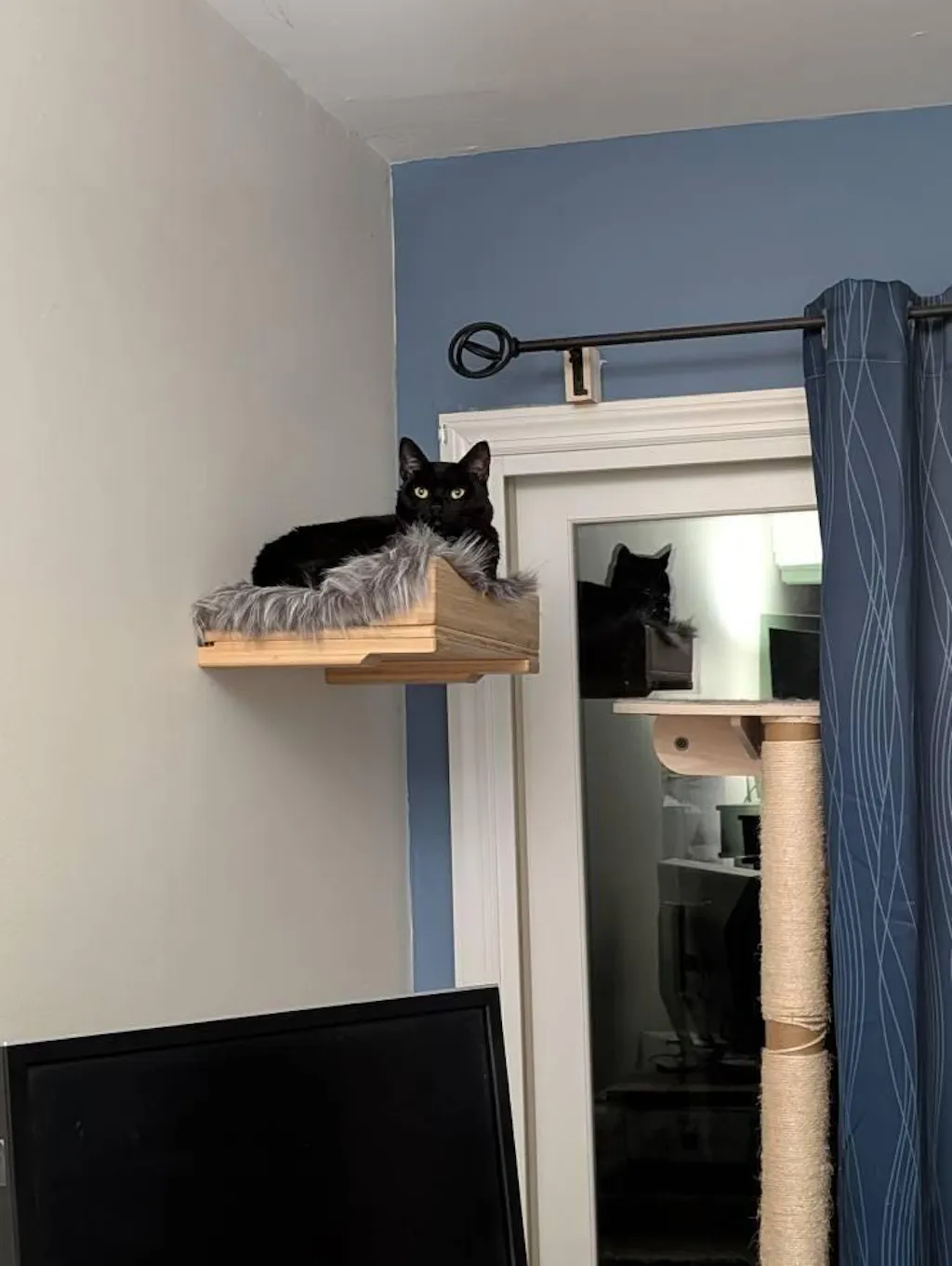 The Nest Cat Bed offers three different shelf types to choose from and a variety of faux fur plush pads and stain colors. Its frame is made from solid bamboo with hidden steel brackets. The front of the bed has a stylish Curved Ledge. This attachment connects to a variety of our shelves to transform them into comfortable cat beds. The Ledge creates a secure barrier for your cat to lean against while keeping the sides open for a cat to lounge out of. We’ve found that our cats prefer having the Curved Ledge to brace their feet against or to look over while feeling more hidden lounging on the wall. The Curved Ledge is an attachment that connects to a variety of our shelves to transform them into comfortable cat beds.