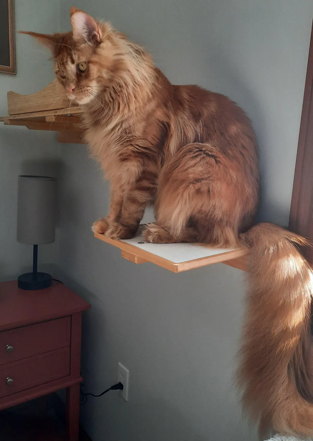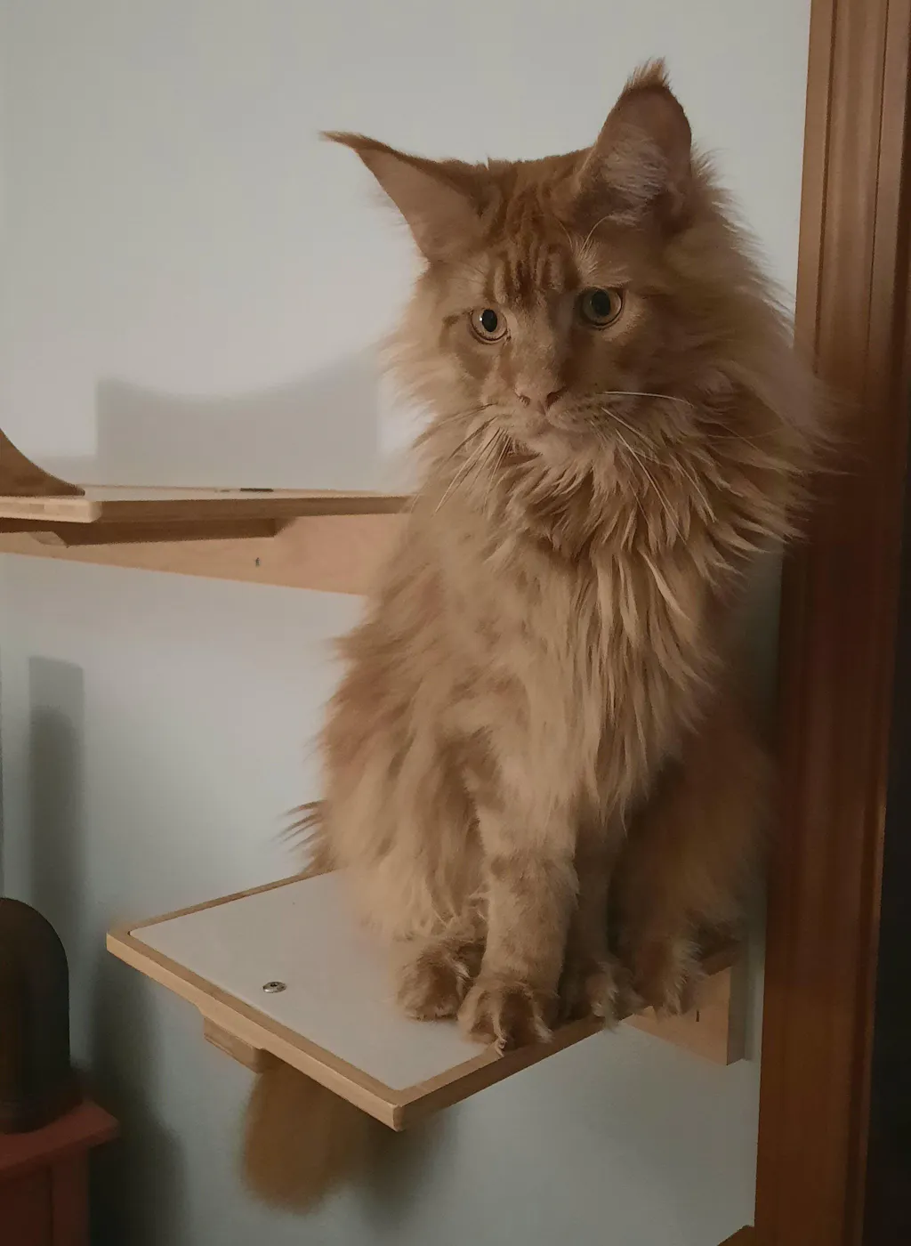 Cat standing on a wooden shelf against a white wall