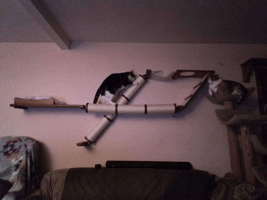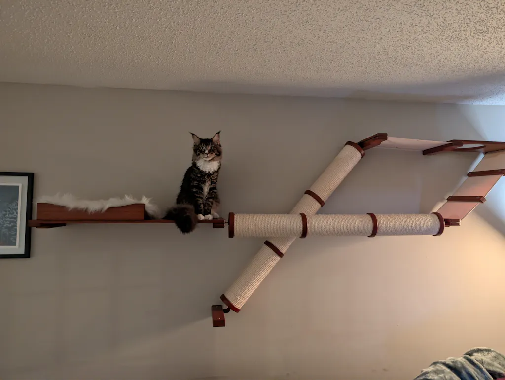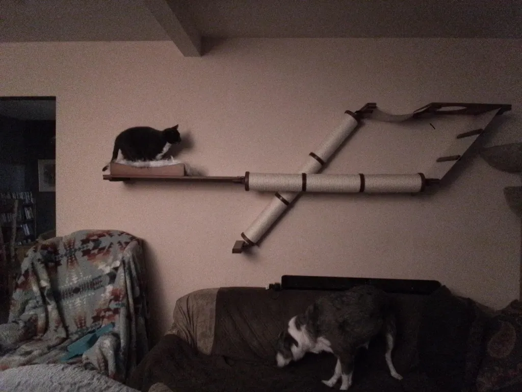 The Plateau is a wide Cat Condo with a unique selection of features. This cat wall incorporates two different Scratching Pole configurations which will please all types of cat scratching behaviors. Whether your cat is a horizontal or vertical scratcher, they will definitely be able to sharpen their claws and get a big stretch on the Angled or Horizontal Pole. This structure also includes a 34” Shelf with a Nest for somewhere plush and cozy to curl up. With multiple levels to play vertically, and a wide span to traverse across, the Plateau will take your cat’s activity levels to new heights!