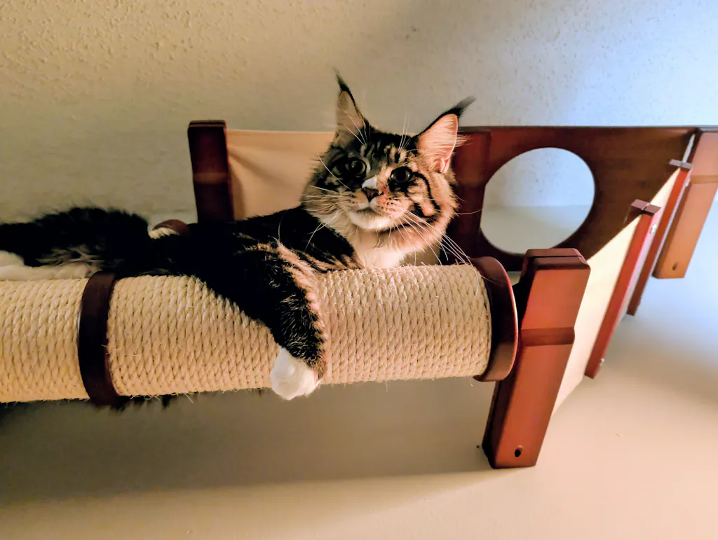 cat lounging on a cat hammock with bridge