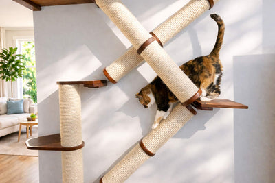 Putting up a cat wall is near the top of the list of behaviorists' recommendations when dealing with behavioral issues in the home. Providing your cat with suitable options for scratching and stretching is a necessary source of enrichment and gives your cat an outlet for exercise. Build them a special area that’s specifically for them and promote them to use it with positive reinforcements like playtime and snacks. Our favorite healthy option is freeze-dried chicken, which can be broken off into small pieces and stretch snack time out a bit.